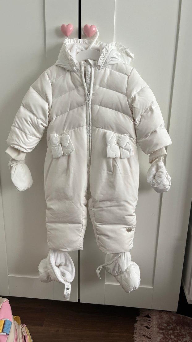 Beyaz renkli, kürklü detaylara sahip bebek kız tulumu. Yaka tipi çıtçıtlıdır, eldiven ve patiklerle tamamlanmıştır. Yumuşak dolgu kumaşlıdır. ❄️