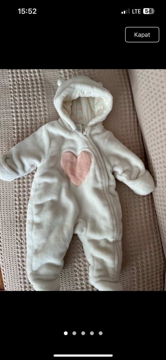 Yumuşak beyaz bebek kız tulumu, kürklü detaylı ve göğsünde pastel pembe kalp deseni. Kulaklı kapüşon ve kesimli yakası bulunur.
