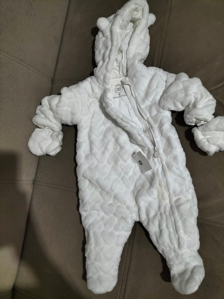 Beyaz renkte, kürklü detaylara sahip bebek kız tulumu, kesik yaka ile sıcak tutar ve rahatlık sağlar. ❄️