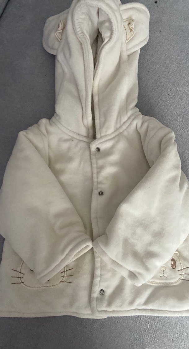 Beyaz renkli, uzun kollu ve kapüşonlu bebek montu. Yumuşak, sıcak kumaştan üretilmiş, kürk detaylı ve midi boyda, günlük kullanıma uygun.