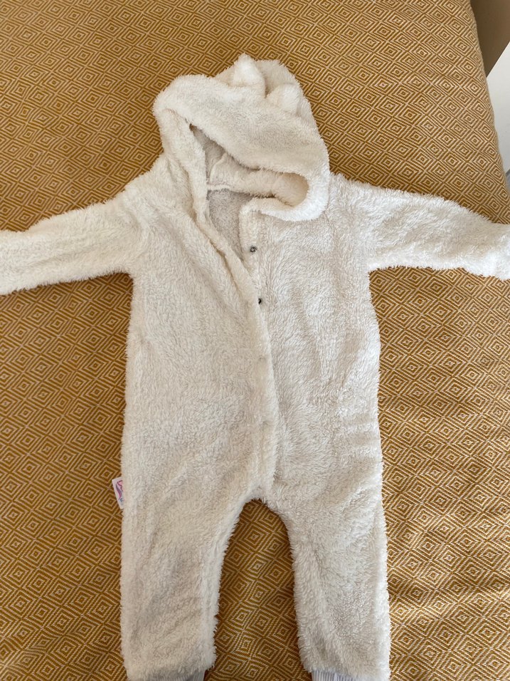 Yumuşak ve sıcak beyaz bebek tulumu, kürk detaylı ve kapüşonludur. Önünde çıtçıtlı, desensiz sade bir tasarıma sahiptir. ❄️