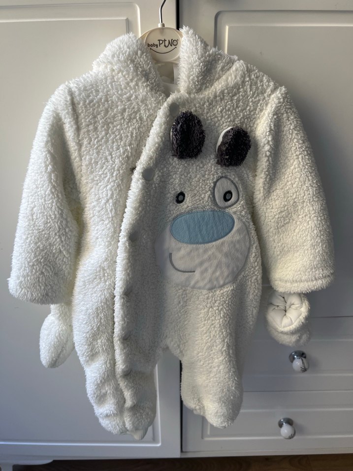 Beyaz renkli, kürklü ve nakışlı ayı desenli bebek tulumu. yumuşak ve sıcak kumaştan üretilmiştir. Bikaç kere hastaneye gitmek için yenidoğan bebeğime giydirdim. Çok kullanılmadı.