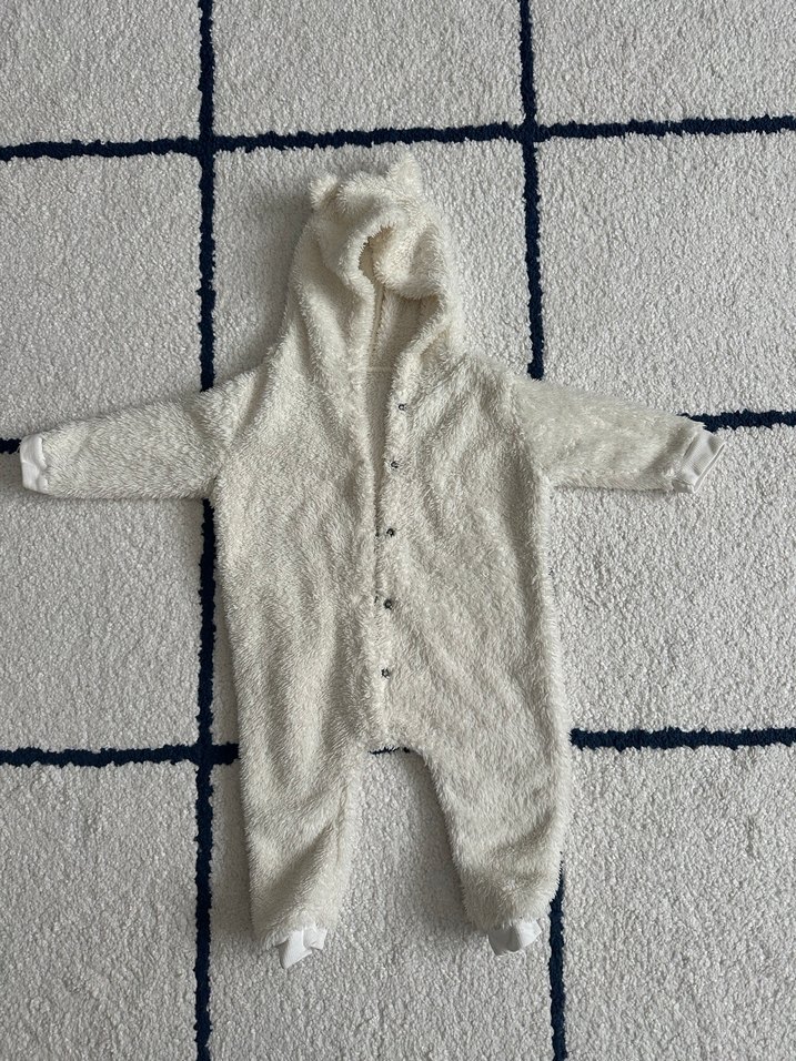 Yumuşak ve sıcak beyaz bebek tulumu, kapüşonlu ve kürklü detaylıdır. Düğmeli ve sade normcore stile sahiptir. ❄️ 0-6 aya kadar kullanılabilir. %100 pamuklu materyali ile cilt dostu bir yapiya sahip olup, hassas ciltler için de uygundur.