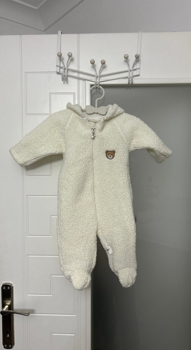 Yumuşak kürk dokusuna sahip beyaz bebek tulumu, kesik yaka ve küçük ayıcık detayı ile. Desensiz ve soğuk hava için sıcak tutar. ❄️