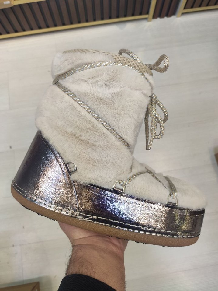 Beyaz kürklü, işlemeli desenli dolgu topuklu bot. Yumuşak ve sıcak fleece kumaş, parlak detaylar ve rahat bohem tarzı sunar. ❄️