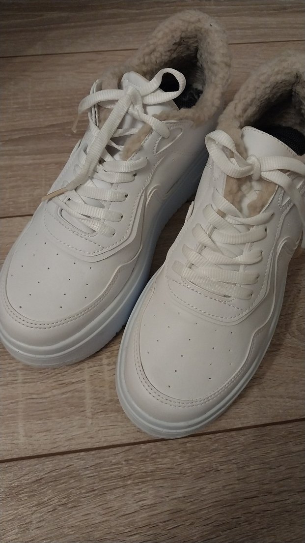 Beyaz, kürklü detaylı ve dolgu topuklu kauçuk kadın spor ayakkabısıdır. Rahat ve şık bir günlük kullanım sunar.