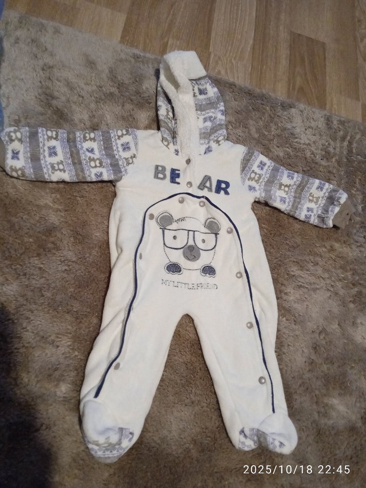 Bu beyaz erkek bebek tulumu yumuşak ve sıcak kumaş, kürk detayları, gri baskılı kollara ve ayı desenine sahiptir. Kapüşonlu ve çıtçıt düğmeli. bir iki kez ancak giyildi 5-6 aylık daha rahat oluyor