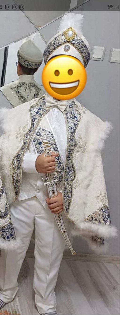 Beyaz çocuk takımı, etnik desenler ve kürk detaylı pelerin ile klasik şıklık sunar. Notched lapel yakalı, uzun kollu ve regular fit.