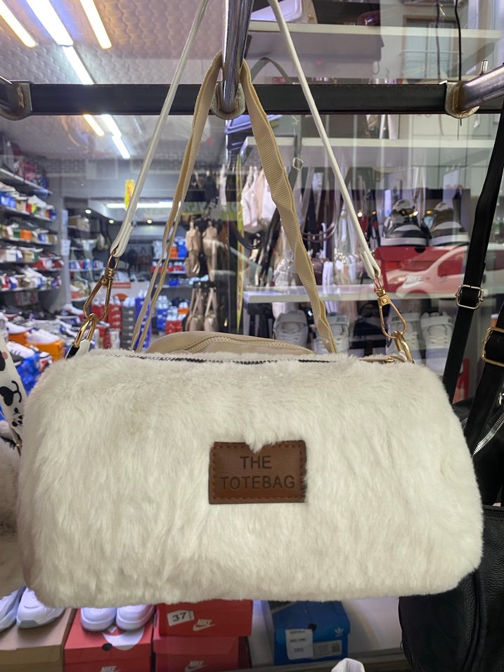 Yumuşak kürk detaylı, baskılı beyaz kadın çantası. Rahat askısı ve sokak tarzıyla günlük kullanıma uygun.