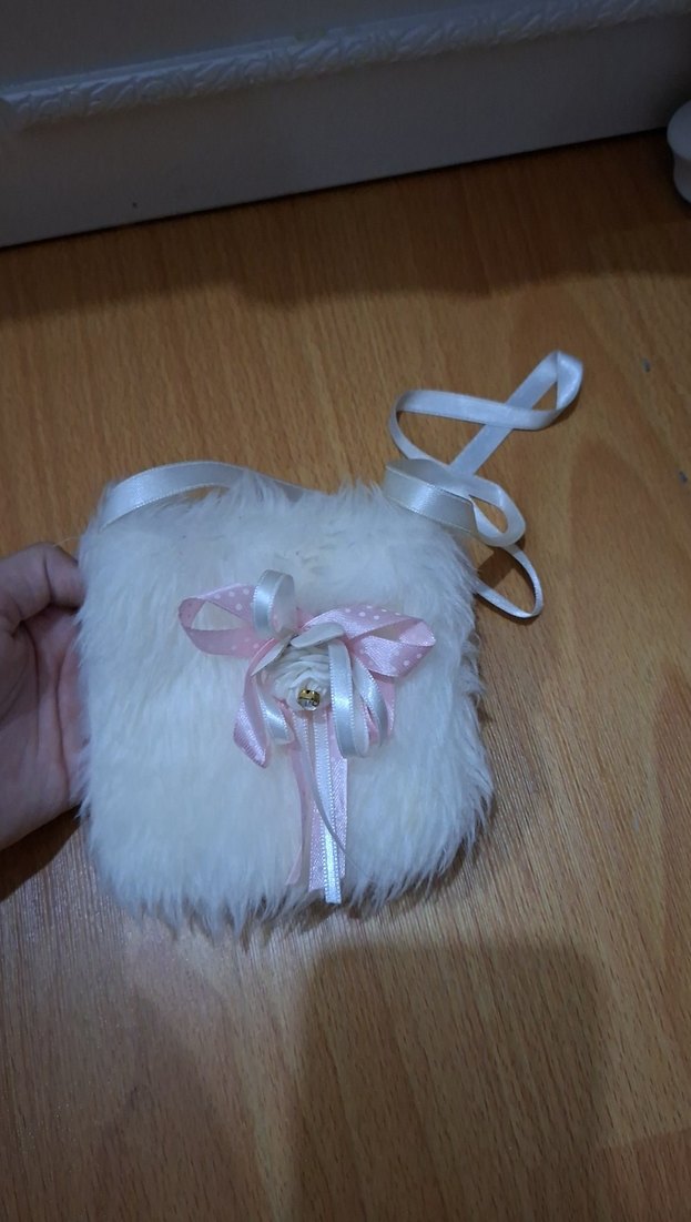 Beyaz kürklü kız çantası, işlemeli detaylar ve pastel kurdelelerle bohem ve nostaljik bir görünüm sunar.