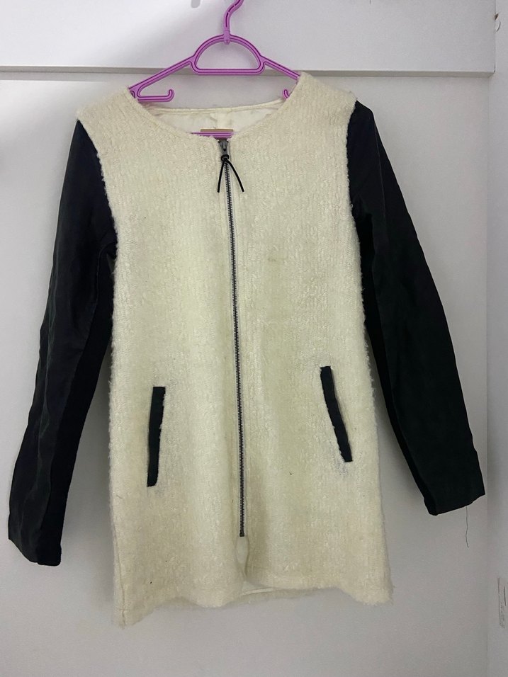 Kadın ceketi, uzun kollu ve bol kesimdir. Yumuşak ve sıcak kumaş ile kürk detaylara sahiptir. Bisiklet yaka ve fermuarlı, beyaz-siyah renk uyumuyla sokak modasına uygundur. Günlük kullanım için idealdir.