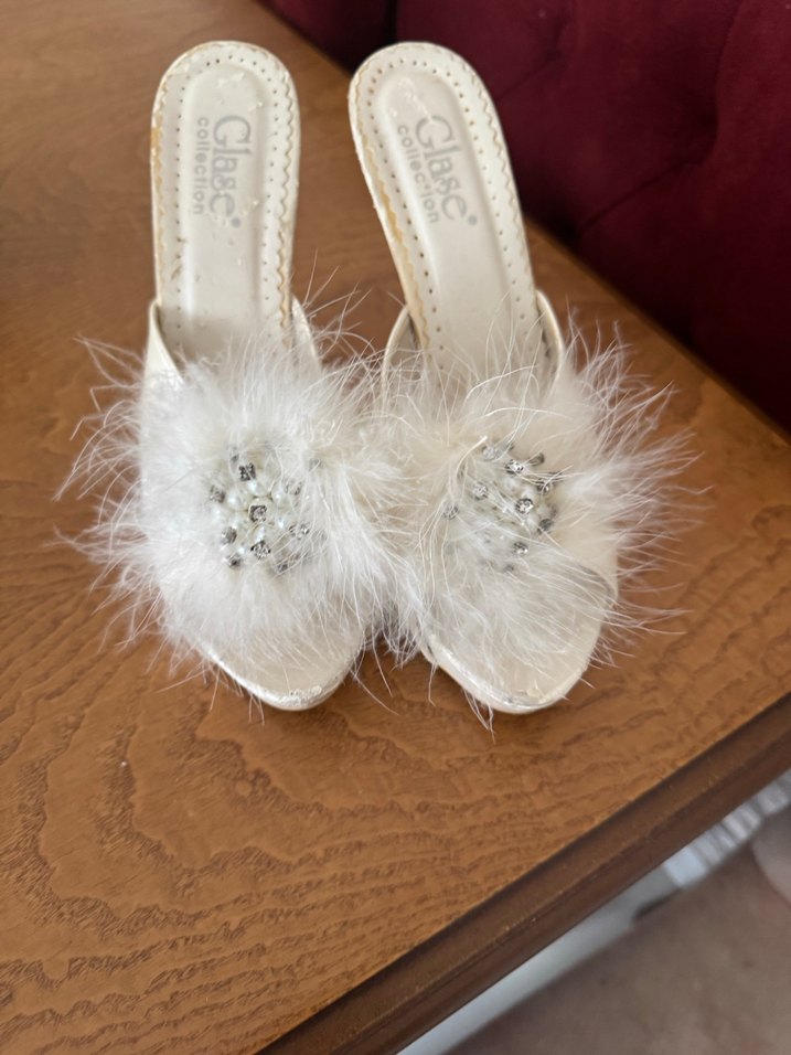 Sentetik kumaştan, işlemeli desenli, kürk detaylı beyaz dolgu topuk kadın terlik. Düğün ve klasik zarafet için uygundur.
