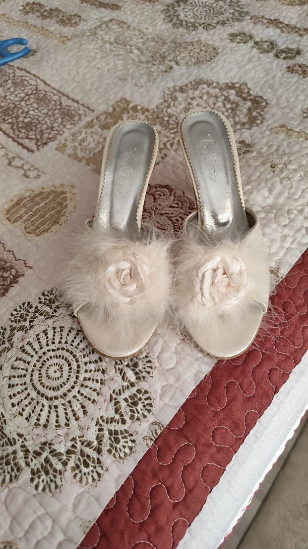 Sentetik kumaştan yapılmış, kürk detaylı ve nakış desenli beyaz dolgu topuklu kadın terlik. Düğün ve klasik zarafet stiline uygun.