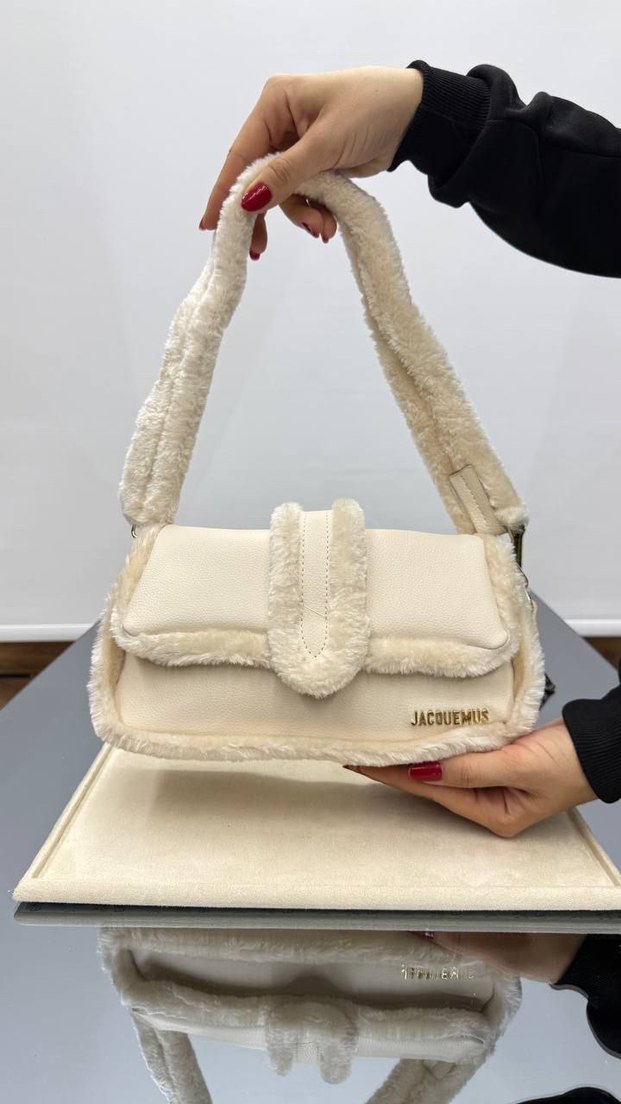 Yumuşak tüylü detaylara sahip beyaz el çantası, kenarları ve sapı kürklüdür. Üzerinde JACQUEHUS yazısı bulunur. Günlük sokak stili için uygundur. A+++ A kalite tüylü A kalite Bby54