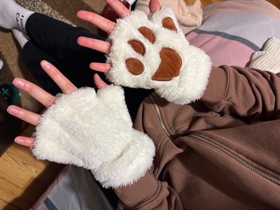 Yumuşak kürk detaylı beyaz eldivenler, paw desenli, rahat kumaştan. Bohem ve retro tarz için uygun .