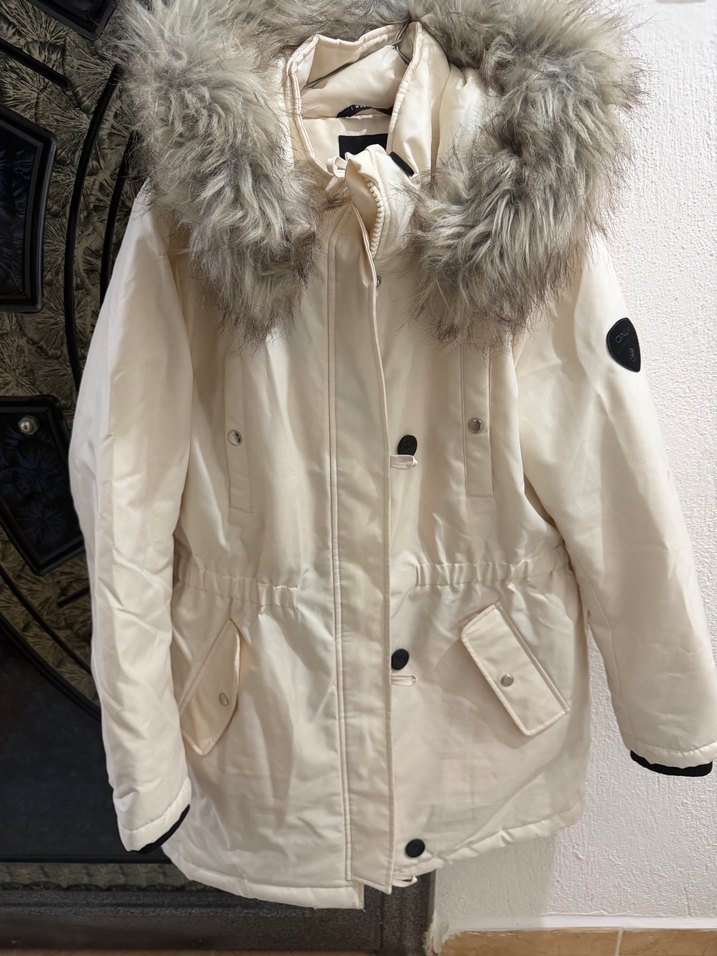 Beyaz renk, uzun kollu, normal midi boyda, kürklü kadın kışlık mont. Rahat kesimiyle dış mekan sokak stiline uygun. Ürün geçen kış boynerden alınmış olup sadece 1 kere giyildi. Şu an sıfırı yaklaşık 2 katı fiyat