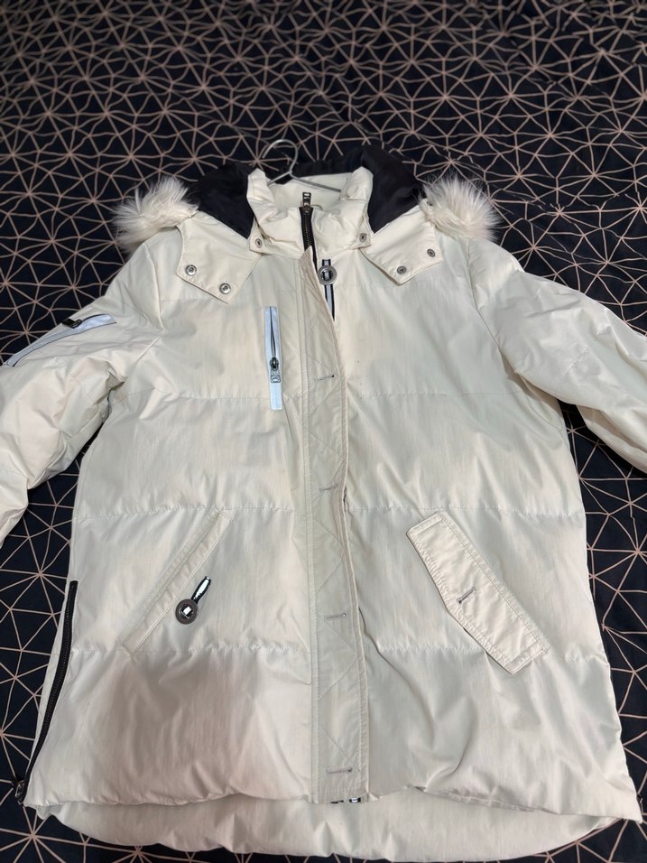 Beyaz şişme mont ltb markasına ait kuru temizlemesi yapıldı hiçbir sorunu deformesi yok şapkası çıkarılabiliyor fermuarlı , kürklü kapüşonlu, uzun kollu, normal boyda, kışlık mont. Yumuşak sentetik kumaştan üretilmiş, fit kesim ve cepler içerir. ❄️