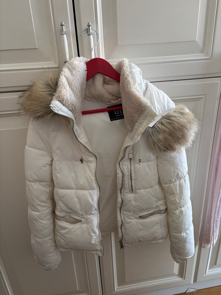 Beyaz, kürklü detaylı, normal boy, uzun kollu, yumuşak ve sıcak kumaştan kadın kışlık mont. Günlük kullanıma uygun, dar kesim ve kruvaze yaka bulunur. ❄️