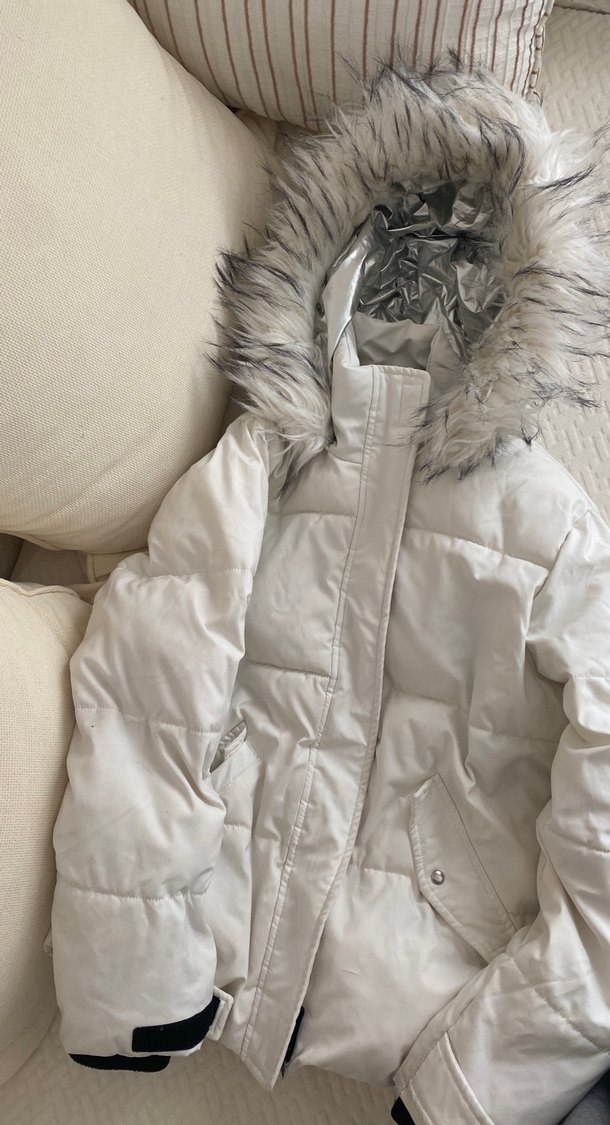 Beyaz renkte, kürk detaylı kapüşonlu, yakalı ve normal midi uzunlukta kadın kışlık monttur. Yumuşak sentetik kumaştan yapılmış, sade ve rahat sokak stili için uygundur.