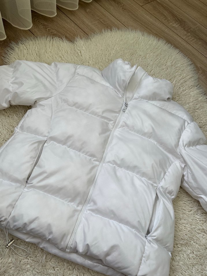 Beyaz, yüksek yakalı ve şişme mont. Sade ve desensiz, günlük kullanıma uygun. Az ve temiz kullanılmıştır.