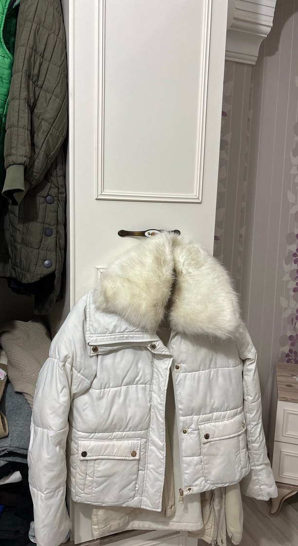 Kürkü tak çıkar formda Beyaz, kürklü yaka detaylı, askılı kollu, normal midi boyda, yumuşak fleece kumaştan yapılmış, dış mekan için uygun, dar kesim kadın kışlık mont.