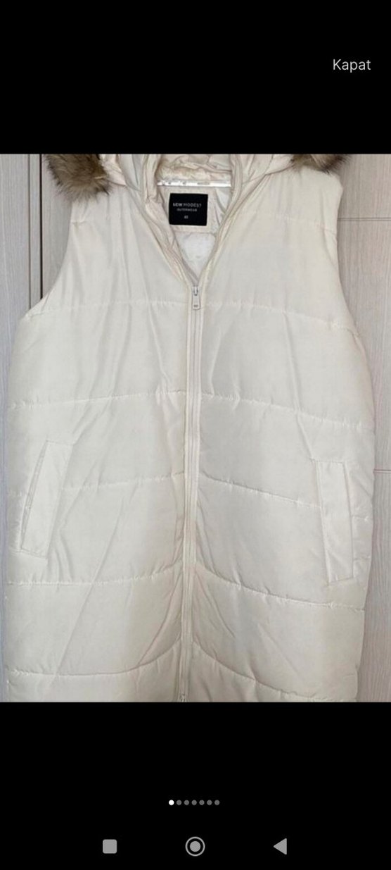 Yüksek yakalı, kürklü detaylı beyaz kolsuz kadın yelek. Yumuşak ve sıcak kumaştan yapılmış, fermuarlı ve cepli, dış mekan için uygun.