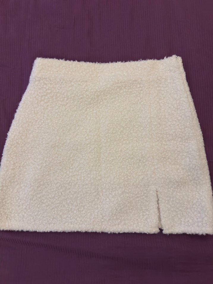 Bir kere giyildi. Beyaz renkli, kürklü detaylı ve dar kesim mini etek, rahat ve sokak stiline uygun tasarlanmıştır.