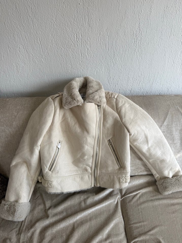 Beyaz, kürklü yaka ve manşet detaylarına sahip, uzun kollu, normal midi boyda, dar kesim kadın mont. Soft ve rahat dokuda.