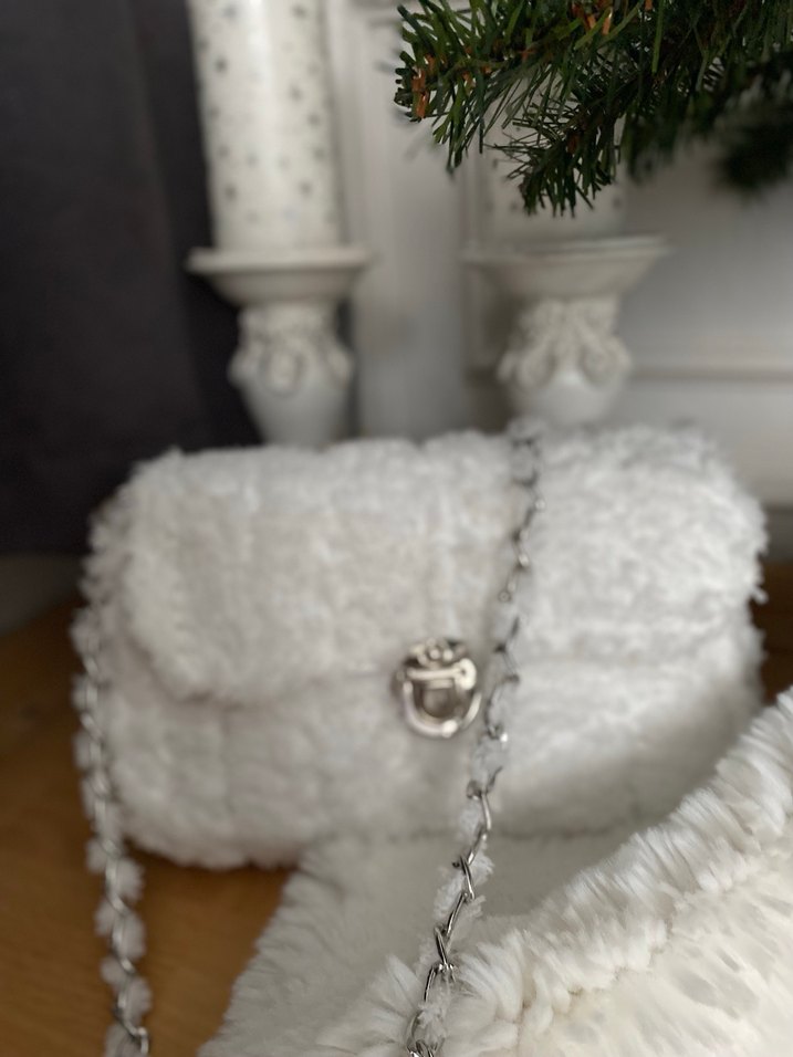 Yumuşak ve sıcak kumaştan, kürk detaylı ve gümüş zincir askılı beyaz kadın omuz çantası, bohem ve rahat tarz için uygundur.