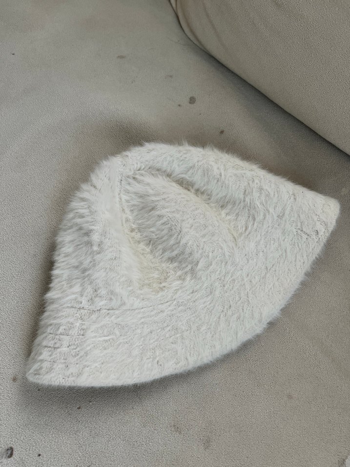 Yumuşak, kürklü detaylı kumaştan yapılmış beyaz kadın şapka. Rahat oturuşlu ve bohem tarzda, sade tasarıma sahip.
