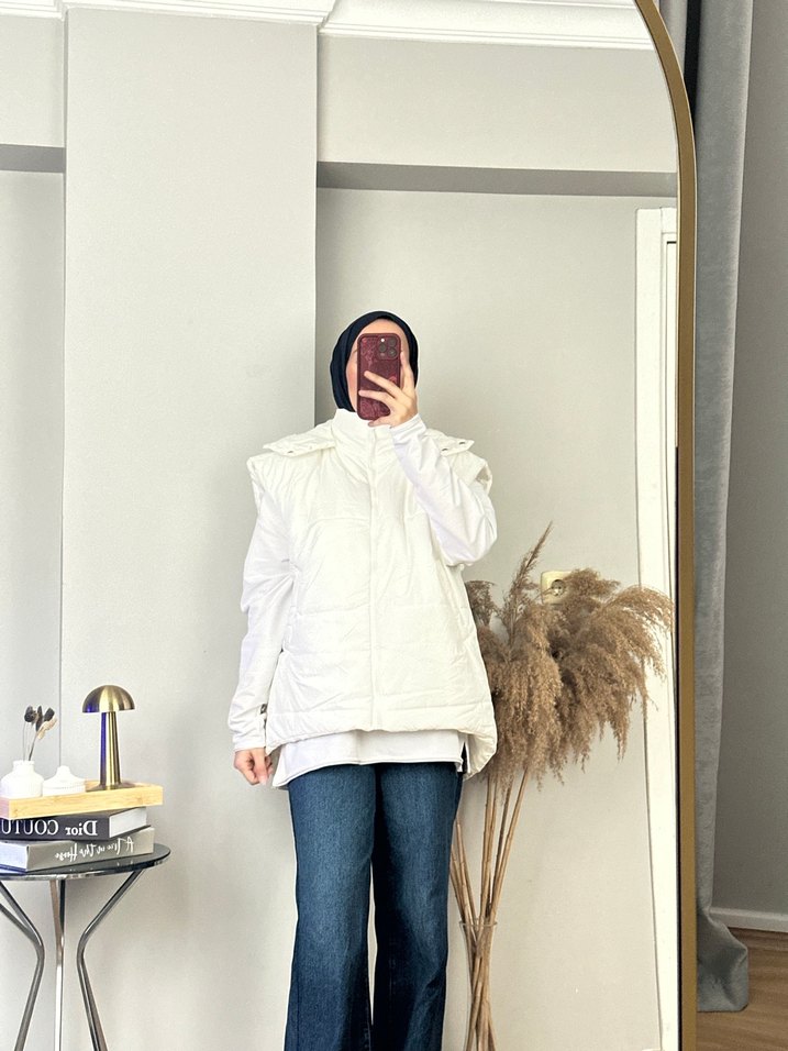 Yumuşak fleece kumaştan, yüksek yakalı, kürk detaylı beyaz, kolu olmayan şişme yelek. Salaş kesim ve midi boy, günlük rahat kullanım için uygundur.