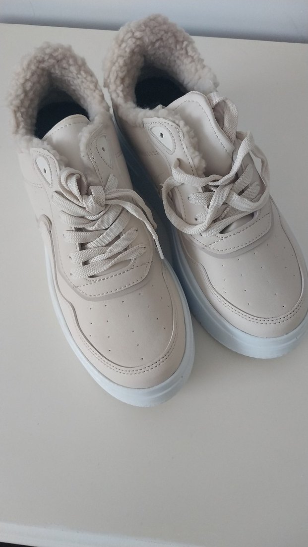 bej renkli, kürklü detaylara sahip kadın spor ayakkabısı. Dolgu topuklu ve kauçuk tabanlı, sokak stiline uygun pastel tonlarda.