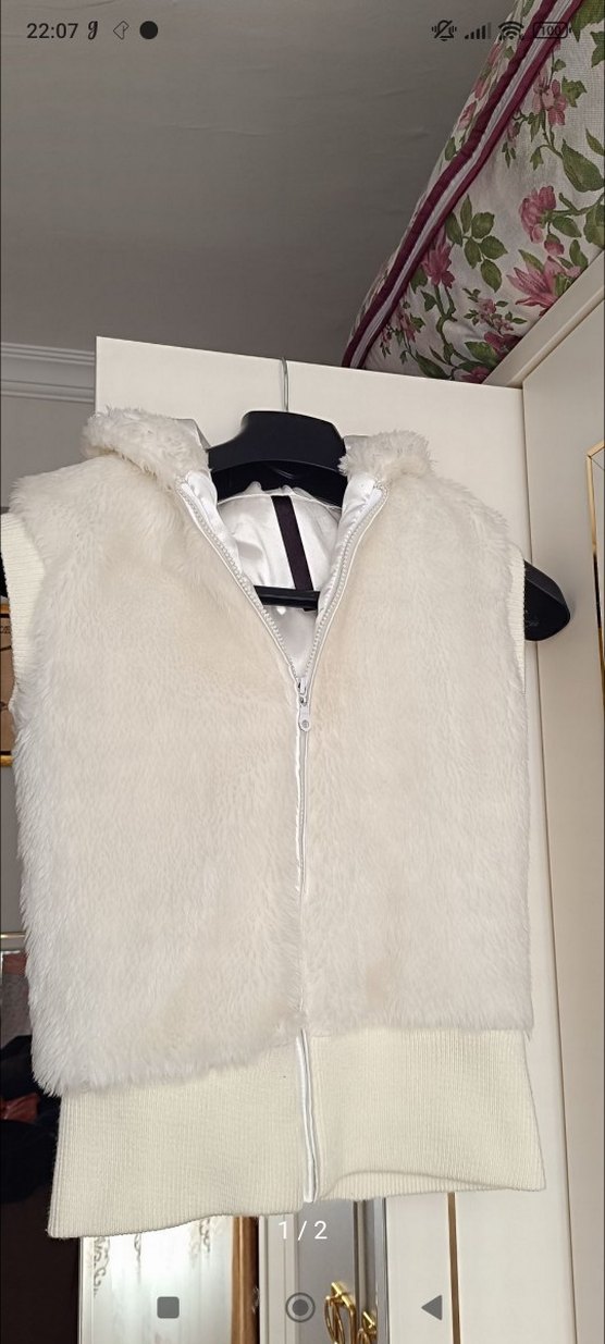 Beyaz, kürklü detaylı, yaka tipi yakalı, yumuşak kumaştan yapılmış, kolsuz ve midi boyda kadın yeleği. Sokak stili ve günlük kullanım için uygundur.