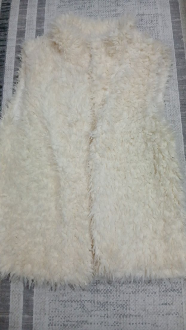 Notlu yakalı, beyaz kürklü ve kolsuz kadın yelek. Yumuşak dokulu ve bohem tarzda, günlük kullanıma uygun.