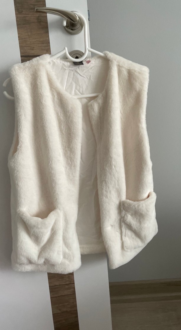 Beyaz, kürklü detaylı, kolsuz ve straplez yaka tasarıma sahip kadın yelek. Midi uzunlukta ve cep detaylı, rahat ve şık bir model.