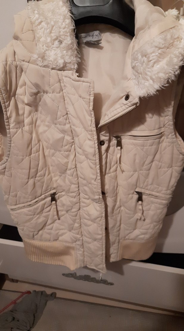 Beyaz, kürklü detaylı, yakalı, dar kesim yelek. Yumuşak sentetik kumaştan, normal midi boyda, fermuarlı ceplerle günlük kullanım için uygundur. boy 55 santim cep fermuarının kenarında çok belli olmayan ufak deformeler mevcut