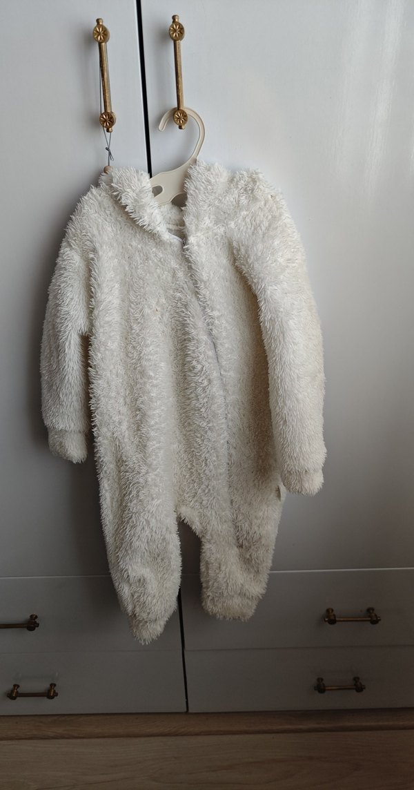 Beyaz Tavşan renkte, kürk detaylı, kesimli yakalı ve desensiz tasarıma sahip bebek kız tulumu, sıcak ve konforludur. ❄️