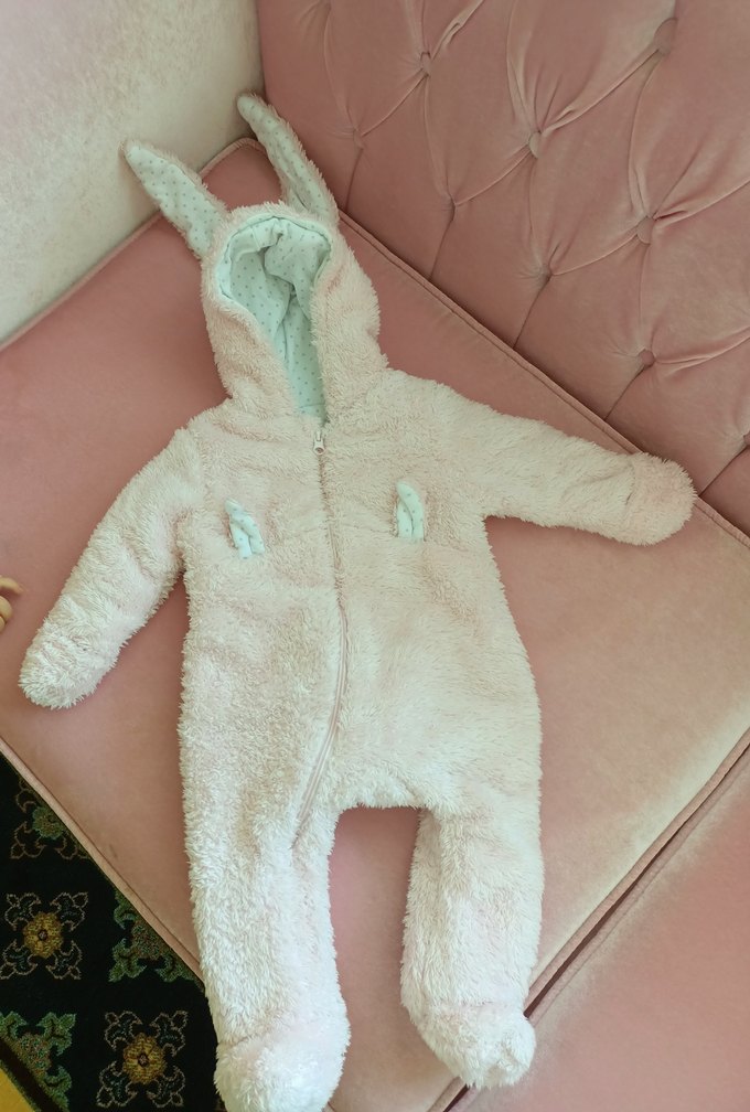 Beyaz pastel renkte, kapüşonlu ve kürk detaylı yumuşak dokulu bebek tulumu, tavşan kulaklı tasarımla dikkat çekiyor.