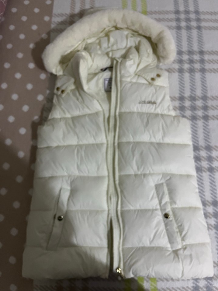 Kürklü kapüşon ve yakalı, beyaz renkli, normal midi uzunlukta, kalıp olarak vücuda oturan kolsuz yelek. Sokak stiline uygun sıcak ve rahat dokuda.