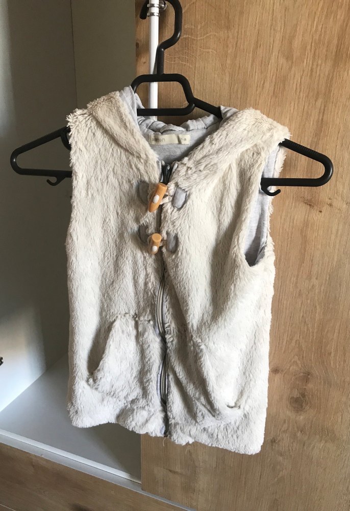 Yumuşak kürk detaylı, beyaz kapüşonlu ve düğmeli, bol kesim kız yeleği. Bohem tarz için uygun.