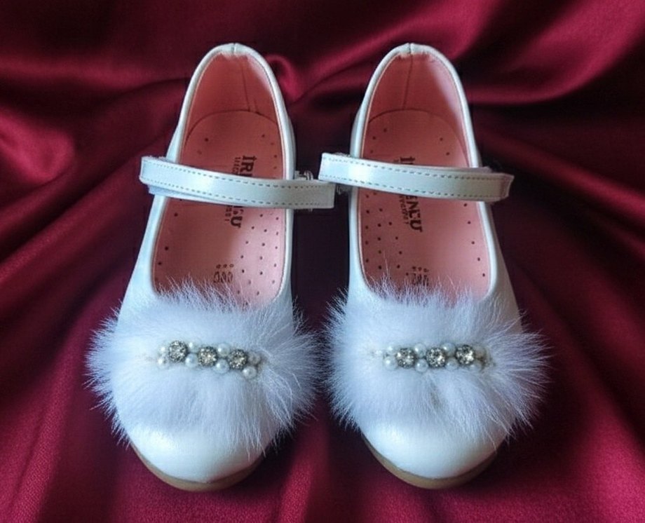 Beyaz kız babet ayakkabılar, ön kısmında yumuşak kürk ve inci detayları bulunur. Kauçuk taban ve bantlı tasarım. Sıfırdır, 23 numara
