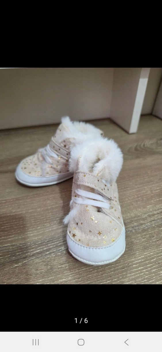 Beyaz, kürklü detaylı ve pastel desenli kız bebek ilk adım ayakkabısı. Yumuşak ve sıcak kumaştan.bir defa giyildi