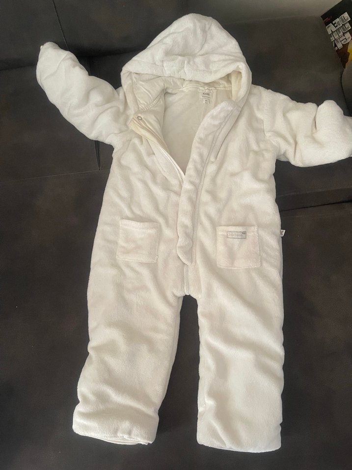 Kürklü detaylı, kapüşonlu beyaz kız bebek tulumu. Yumuşak ve sıcak kumaştan, notched lapel yaka ile rahatlık sağlar. ❄️