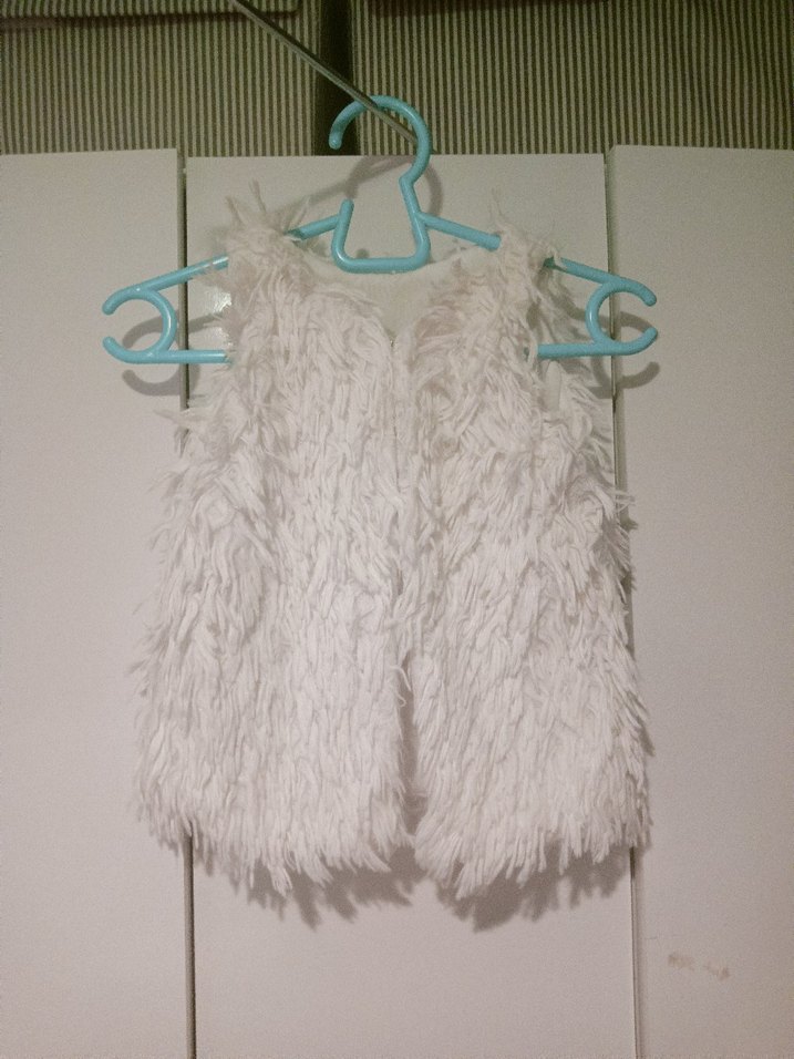 Yumuşak kürk dokulu, beyaz renkli, straplez kesim ve fitted model kız çocuk yeleği.