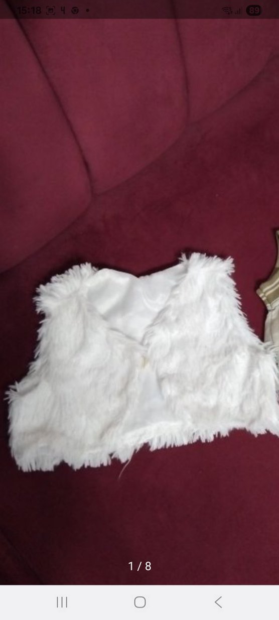 Bu beyaz, parlak kürk detaylı kız çocuk yeleği, v yaka ve kolsuz olup, yumuşak ve sıcak dokulu kumaştan yapılmıştır. Bohem tarzda ve desensizdir. ✨4 beden yazıyor ölçüler ekli iade yok iyice bakıp alınız
