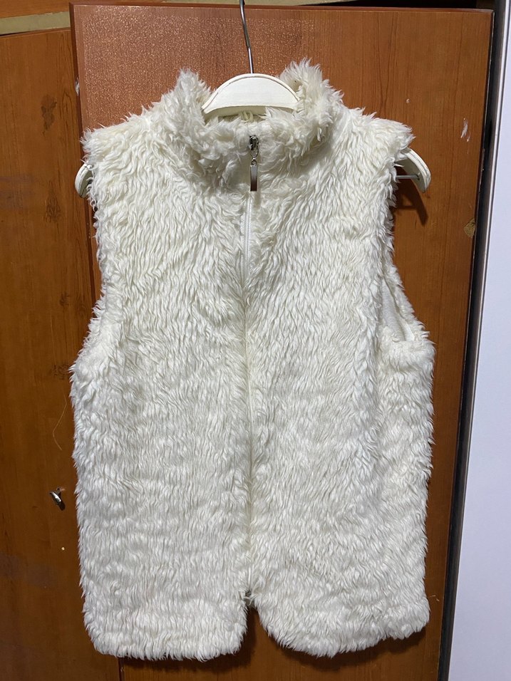 Kolsuz, beyaz ve kürk detaylı yelek, yüksek yakalı ve vücuda oturan kesime sahiptir. Sıcak ve rahat midi uzunluktadır.