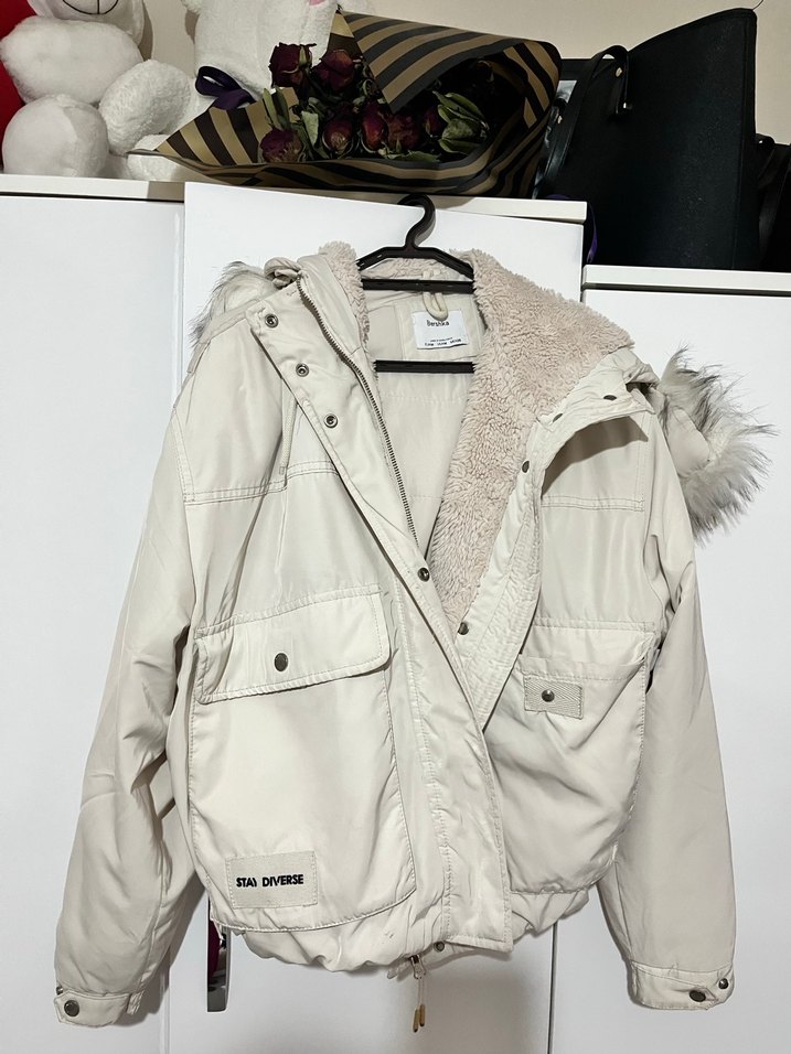 Beyaz renkli, kürklü kapüşonlu, uzun kollu, salaş kesim midi kadın ceket. Sokak stiline uygun, yumuşak ve sıcak dokulu kumaştan üretilmiştir.