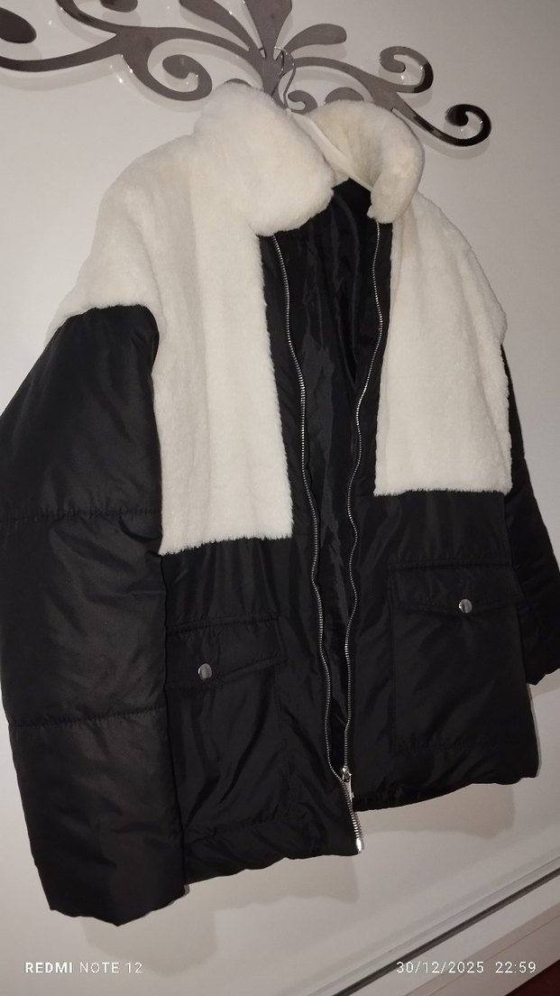 Yüksek yakalı, kürklü detaylı beyaz kadın kış ceketi. Gevşek kesim ve askılı kollarıyla rahat ve şık, günlük kullanım için ideal.