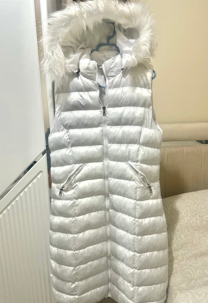 1-2 kere giyildi 36-38 uyumlu .Beyaz, kürklü kapüşonlu, fermuarlı cepli, şişme ve vücuda oturan kadın yeleği