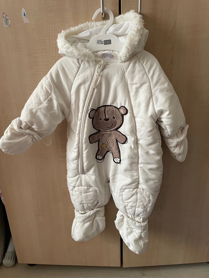 Kapüşonunda kürk detayları ve önünde nakışlı ayıcık deseni bulunan beyaz bebek tulumu. Notch yakalı, rüzgar geçirmez sıcak tutar. Tertemiz defosu yok❄️
